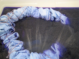 But they're in our bathroom, and the bathroom is tiny, so the washer and dryer is all anyone sees. Plus our extra cat litter, broom, and potting soil or whatever we've thrown in there because there's no room for it anywhere else. I've been looking for a nice curtain or even bedsheet to hang up and add some pattern while screening it off, but haven't been able to find anything nice. I took a class on dying in college, though, so I decided to shibori dye a bedsheet myself.